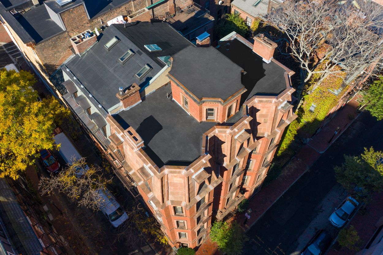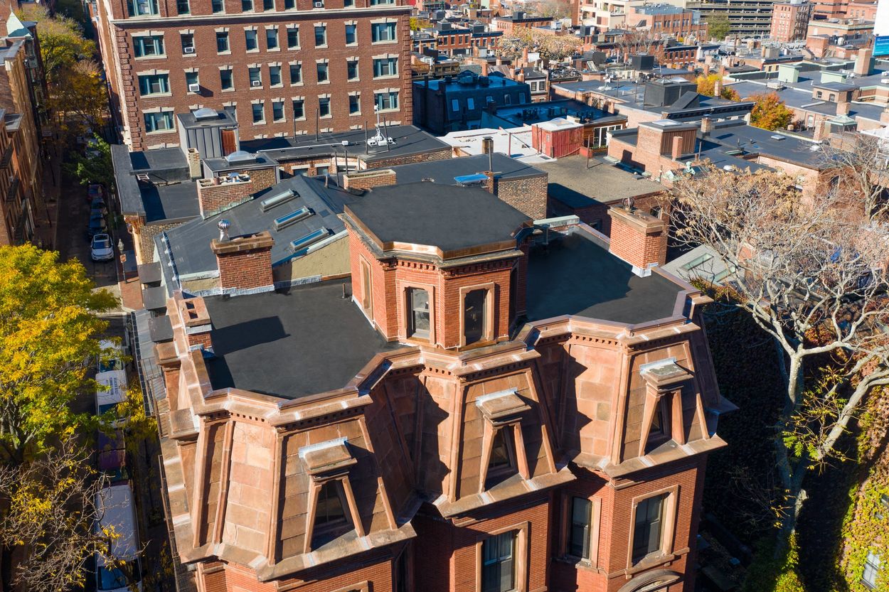 This is a Multi-unit residential building at 107 Beacon St Boston. This was a fun project! We got to use many of our skills. We installed a EPDM Fully Adhered roof replacement system, Mansard Slate Roof, Snow Guards, with all related Copper Custom Flashing and gutter.